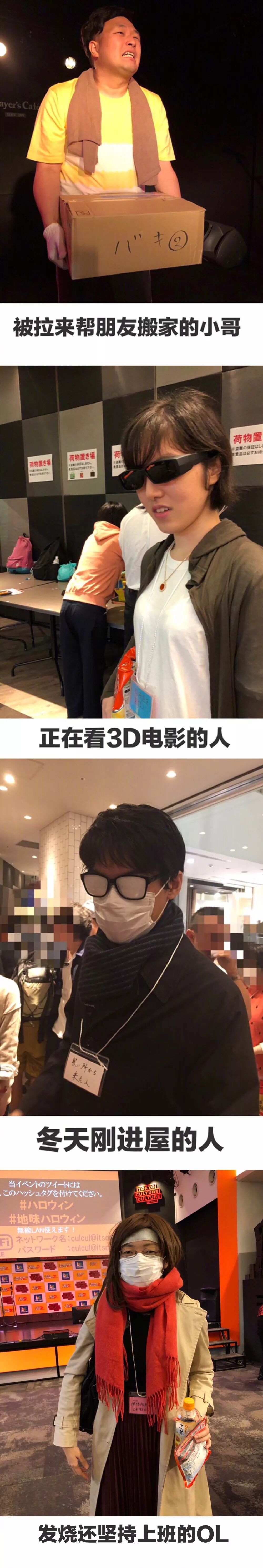 为了老少皆宜,我们特意选取了霓虹的另类万圣节装扮大会,一年一度的“接地气cosplay”,禁止cos动漫角色演艺明星,禁止穿着华丽妆容妖艳,必须土味沙雕接地气cos日常生活中的人,同时又让人一目了然get到...难度极大,然而每一个都是神还原啊!